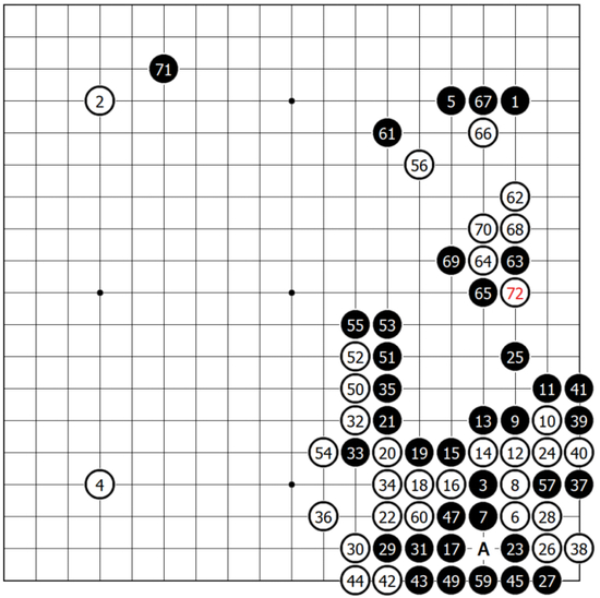黑右上的攻击没有奏效。63拆二应直接71位挂角慢慢下,65也应72位退对白压力更大,实战白72位打与挡见合,治孤成功,布局也取得成功。