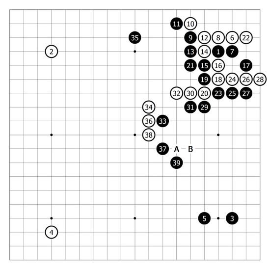39走A位并更好,实战的尖留下了B位刺的味道,白在右边破空时借用更多。说实话如果没研究,很难有A这种“呆并”的感觉。