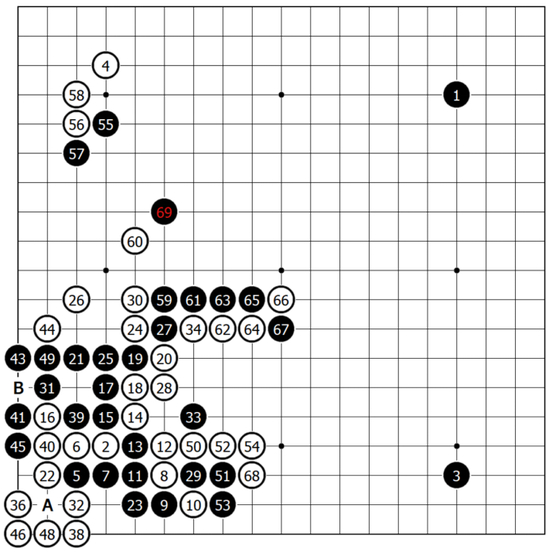 因为左边比较厚,白42、黑49都偏缓,应该在右边行棋(42走A位挂角,49走B位大飞守角)。