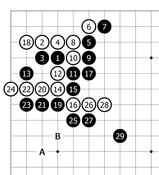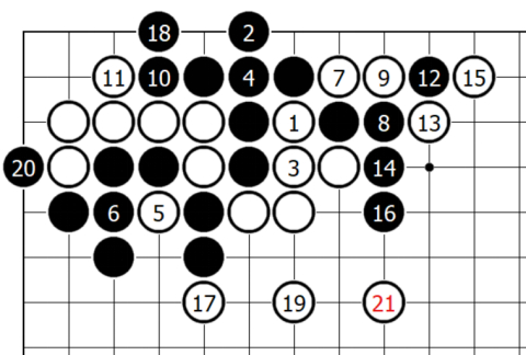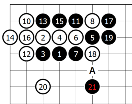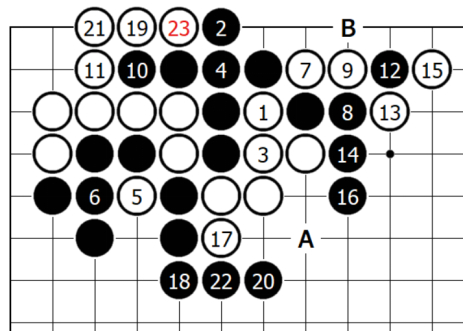 白如在12位吃,势必形成转换。黑改为滚打后吃白一子,白从另一侧飞出,如图的变化也在实战中出现过很多次(黑21如能A位征死,局部白不满)。