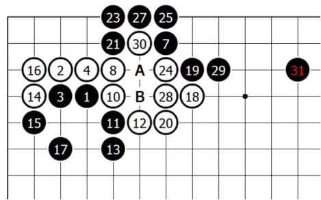 白17弯是为了造劫材,黑18原先下法是直接去角上收气,然后白靠B位打劫,有18位打的劫材。但现在有了新下法,黑18退一个冷静弃子,大部分配合竟然是黑不错。