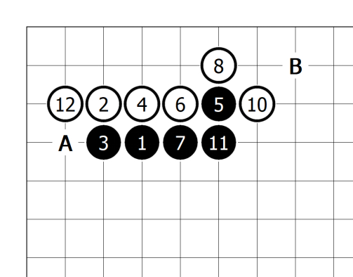 在实战中8扳后脱先很常见,黑可以视配合选择走前面讲的12位扳或更简明的10位长。当然,黑脱先了白也可以继续走,10、12打了立是最常见的下法。然后黑通常不会A位跟着挡,会继续脱先。如果上面比较重要,12也有在B位虎的。