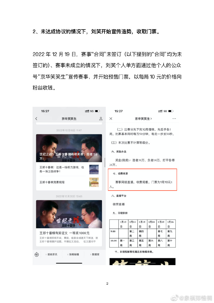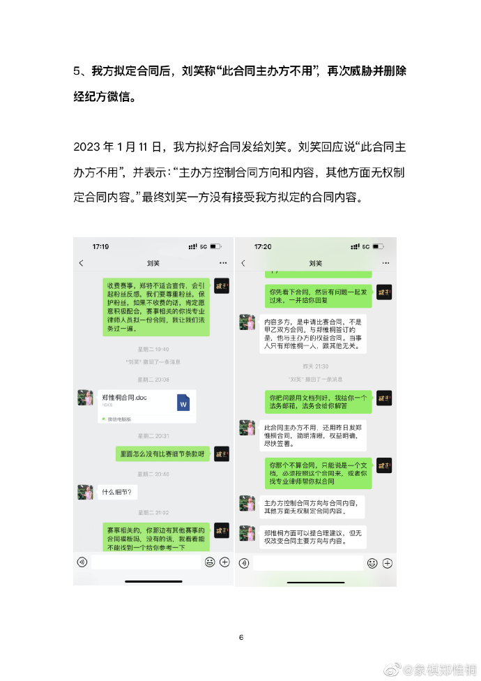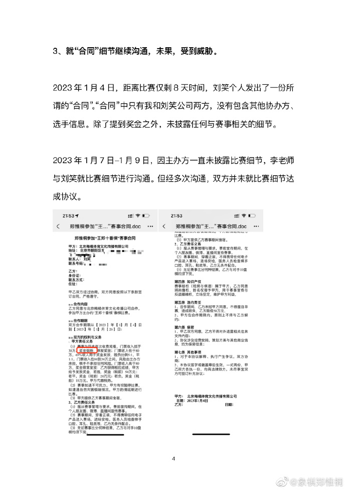 当晚22时,郑惟桐再度发博《“王郑十番棋”隐藏的真相》,文中指出刘笑在与其未达成合作协议的情况下便开始宣传造势,将刘笑提供的合同称作“不平等合同”,更表示刘笑在沟通合约的过程中对其进行威胁。