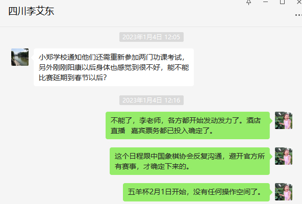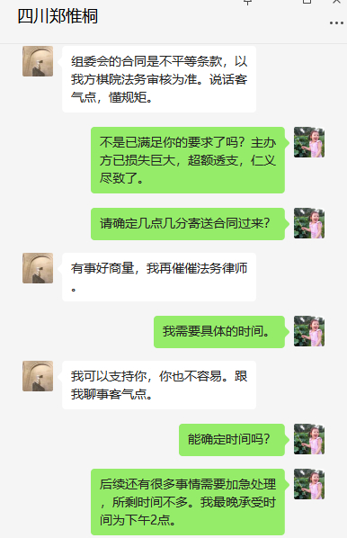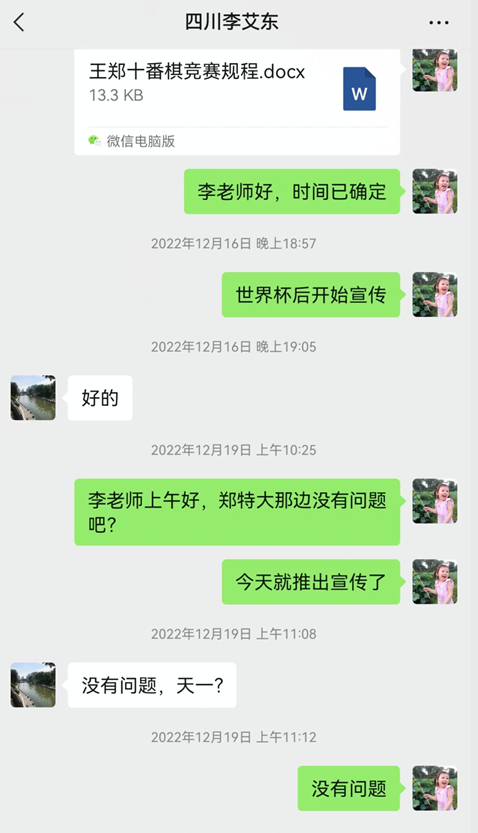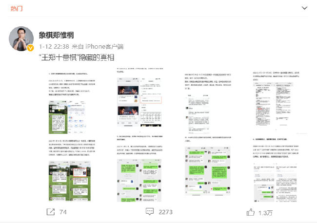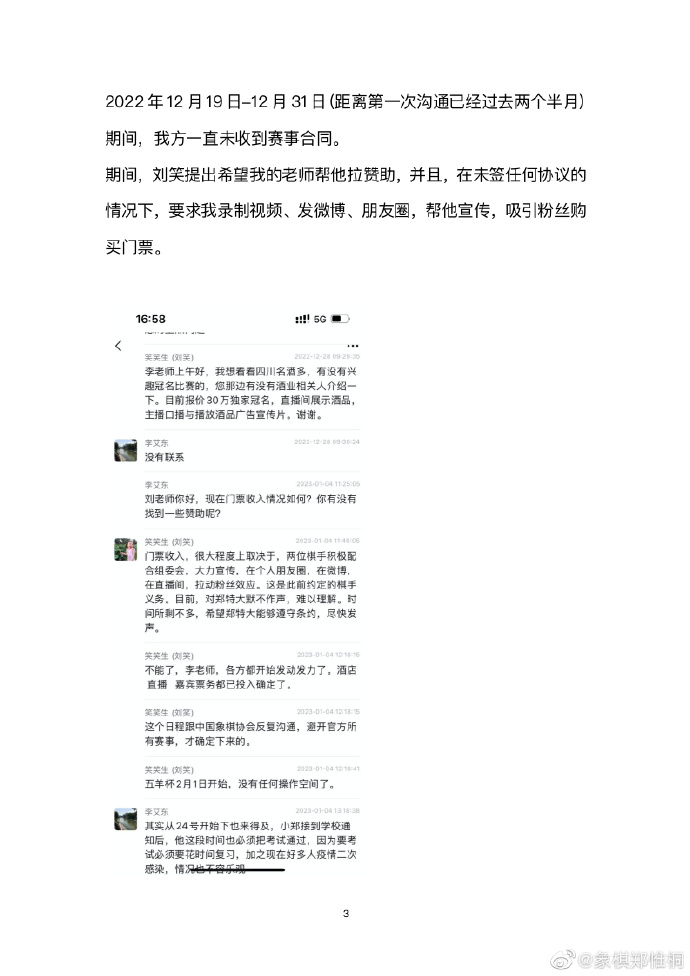 几小时之后,十番棋主办方代表人刘笑在其个人公众号发文《关于“王郑十番棋”郑惟桐单方违反约定声明》,声明中曝出多张聊天记录,直指郑惟桐方多番临时提出要求,最终又临阵反悔。记录中郑惟桐方多次出现的“懂规矩”、“客气点”等字眼也成为网友口中的新“热梗”。