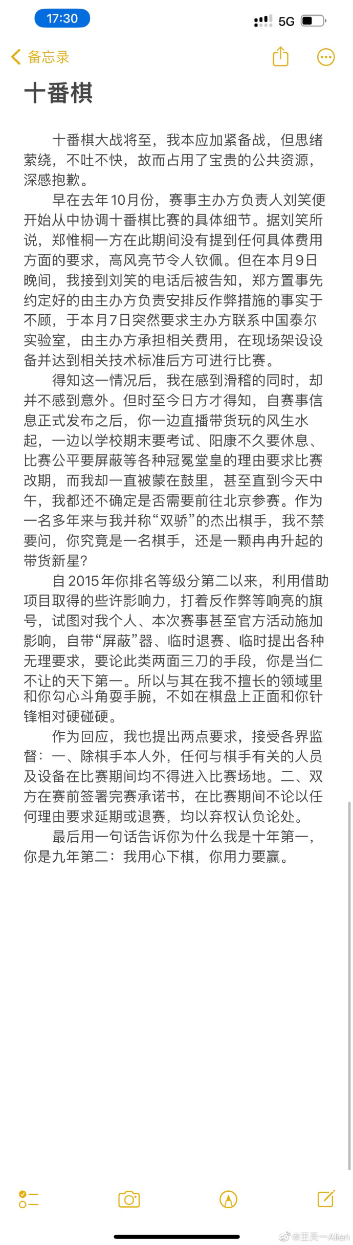 11日,王天一突然发文《致敬爱的郑特大》,文中直指郑惟桐在十番棋大战将至之际,向主办方提出诸多临时要求,又提及有关郑惟桐的过往争议事件,并在结尾喊话:“最后用一句话告诉你为什么我是十年第一,你是九年第二:我用心下棋,你用力要赢。”