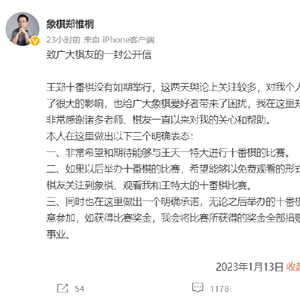 日前,中国象棋界王天一、郑惟桐两位明星选手的恩怨引发热议。原本二位将于本月进行十番棋之战,本是一件棋坛盛事,王天一与主办方却先后发文称郑惟桐诸多为难使十番棋难以进行。郑惟桐此后连发两条博文回应,被网友评论为:“有些苍白无力”。昨日17时,郑惟桐再度发博《致广大棋友的一封公开信》,信中表示其十分期待十番棋,并希望以免费观看的形式举行,若有奖金会捐出。