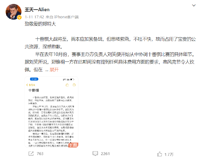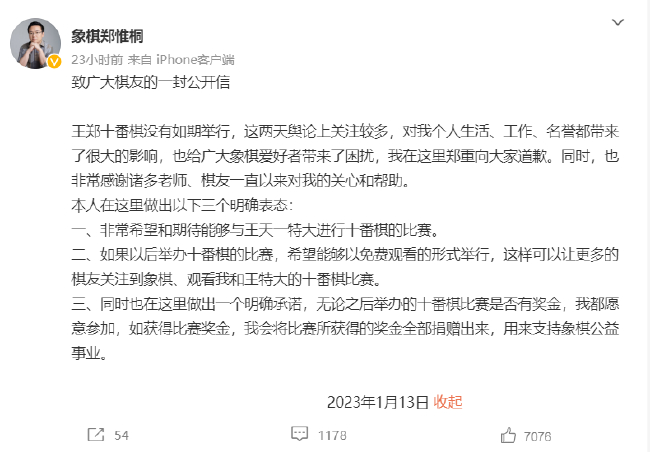 13日下午17时,郑惟桐再度发文《致广大棋友的一封公开信》,似乎是回应此前网友的揶揄,郑惟桐在信中表示:“非常希望和期待能够和王天一特大进行十番棋比赛。”,并提到“希望能够以免费观看的形式举行”、“无论之后举办的十番棋比赛是否有奖金,我都愿意参加”。