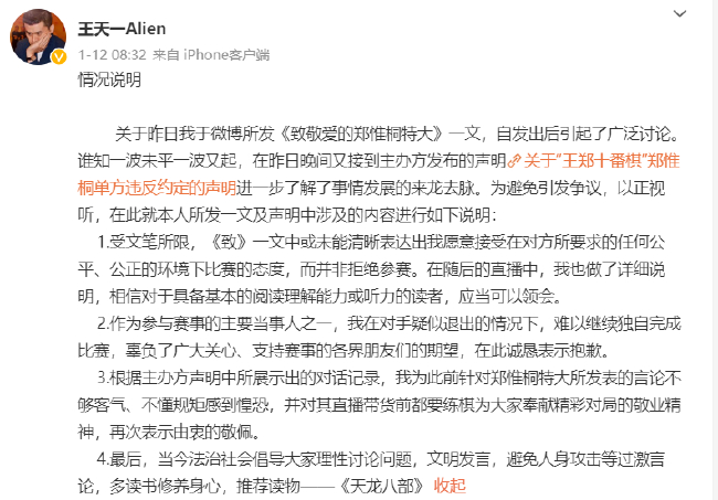 12日早上8时,王天一再度发文,称难以独自完成比赛并向观众致歉。文中更是写道:“我为此前针对郑惟桐特大所发表的言论不够客气、不懂规矩感到惶恐。”