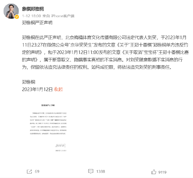 郑惟桐再度发文回应:无论有无奖金都愿进行十番棋