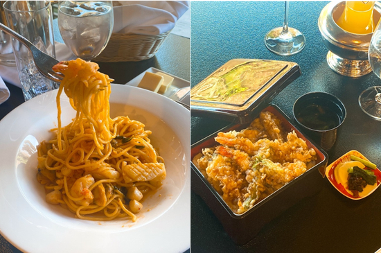 第一日一力午餐:海鲜意面(左)、乌龙茶。芝野午餐:天妇罗盖饭、橙汁(右)。