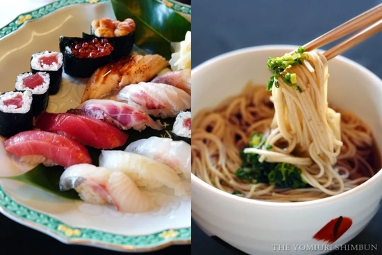 第二日一力午餐:海鲜寿司(左),芝野午餐:荞麦面(右)。