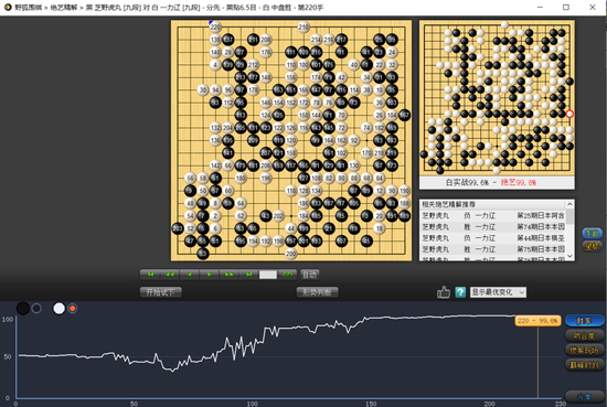 毕竟是多年未见的没有井山裕太出现的两日制比赛,两位年轻人慎重多于放松。全盘没有特别大型的战斗,执黑的芝野虎丸在右边发起攻击,又转换转身,一力辽抢得先手圈住左边后便稳稳保持优势。最后时刻黑棋强行劫杀白龙,也以无果告终。