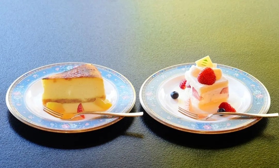 第一日下午茶点:一力水果蛋糕(右),芝野乳酪蛋糕(左),饮品均为冰咖啡。