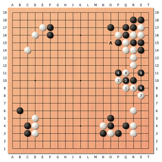 棋圣战第1局进入了下午的战斗,此时在右边展开攻防,一力辽的白82(A位)选择长出。