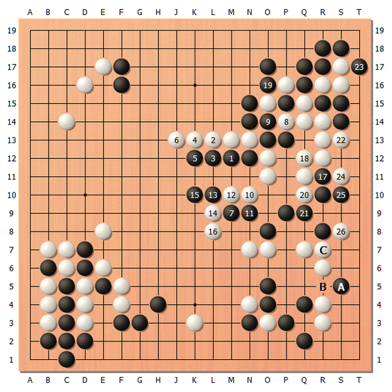如果在中腹行棋的话就是A位,这是避免黑棋在上方形成大模样的下法。然后是右下角白B联络,这手棋在实空的出入方面价值也很大。另外就是白C的挖,瞄着左下角出动2子的味道,强化左边的黑棋。当然“其他手段”的可能性也很大,一力辽究竟会下出哪一手棋呢?