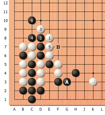 此时黑1开始的变化是其中一个,白2开始分断的话,黑7立下。白8吃掉右边之后,林汉杰表示:“这样的话感觉黑棋还不错”。这个时候还有其他下法,需要考虑的是选择哪一种变化。但是芝野虎丸此时选择了脱先,在左边B位选择了肩冲。留着断点的右边,左边黑棋还有逃跑2子的手段,研究室表示:“芝野虎丸变化自在的脱先,形势很接近,这也是芝野虎丸的看家本领”。
