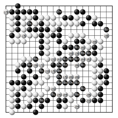 黑151小尖,双方进入中路大乱斗模式。白152冲略俗,被黑153灵巧避开。黑155的尖断也略显鲁莽,遭到白158犀利的飞点,黑棋简单包扎后,169大飞逃窜。忽然,连笑起了杀心,170点直冲黑棋咽喉。不过老芈也不是软柿子,179跳后,181、183各种腾挪手段来回耍,双方中腹打的难解难分,白棋似乎也无法强杀黑棋。白186出现失误,在杀不掉的情况下折损了目数至黑193,黑棋大龙连回,惊心动魄的厮杀终于结束了。