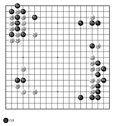黑103小尖,白棋104朴实的打完扳,逼迫黑棋连回。左侧110扳出,先手便宜后,抢到巨大的114长,一连串操作下来,白棋手感火热状态上佳。面对黑119点入,白120稳重的压住,至黑125,虽然黑棋连回家,但是白棋外围厚实,发展潜力很大,白136飞死棋筋后,白棋优势明显。可是,面对黑141考验,白142没有沉住气,被黑143拉走棋筋后,局势瞬间变乱,至黑149飞,白棋拿不住黑棋,自己的棋形也收到冲击,局面已经失控。