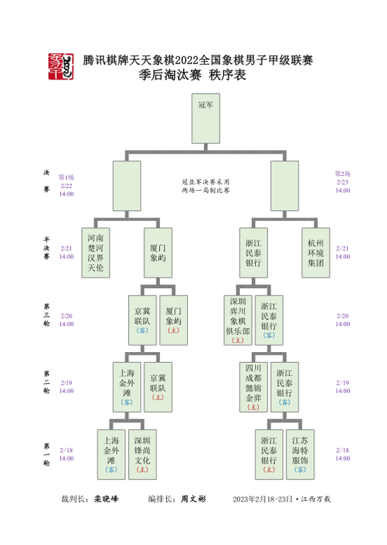 2023年2月20日,“腾讯棋牌 天天象棋”2022全国象棋男子甲级联赛季后赛第三轮比赛在江西宜春万载县山水迎宾馆赛罢,厦门象屿队击败北京威凯金环建设京冀联队、浙江民泰银行队战胜深圳弈川队,厦门、浙江晋级四强。
