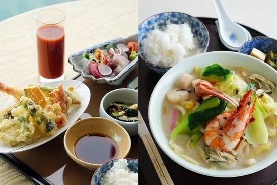 一力辽点了“当地蔬菜天妇罗和鲜鱼刺身套餐”,还有大岛番茄汁,芝野虎丸点了在前一天采访中提到了“长崎杂烩面”。