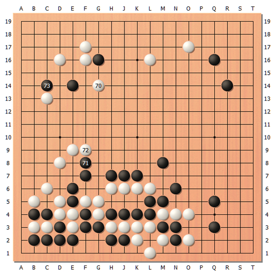 一力辽白62一路虎之后,实战行至白70。白棋在白68活得很大,但是黑69小件之后白棋7子就被吃。