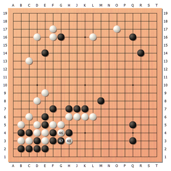 实战一力辽选择了白46和白48的冲断。这个时候双方进入了午休时间,对局继续之后有可能还会在下方展开攻防。
