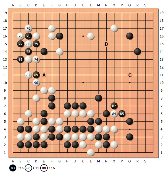 实战从黑73到白82,正如研究室研究,左上角展开了劫争。