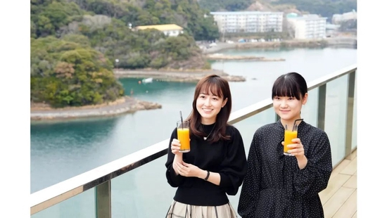 在大岛的“著名景点”拍照留念,一力辽与芝野虎丸充满笑容