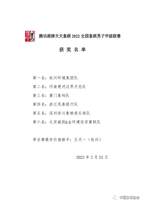 至此,2022赛季全国象棋男子甲级联赛的大幕便徐徐落下,杭州队不仅获得总冠军,王天一个人也凭借自己优异的表现包揽了常规赛、季后赛最有价值棋手两项殊荣。