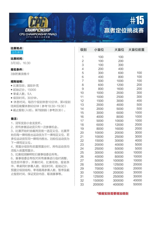 3月7日为第二轮比赛,级别时间为60分钟,进行10个级别后结束;