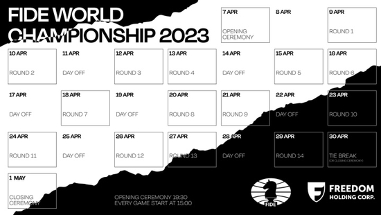 阿斯塔纳的冠军赛将再次设置14局,先到7.5分的棋手胜出。时限为前40步120分钟,接下来20步60分钟,最后是15分钟包干,每个阶段都是每步增加30秒。如果14轮之后平局,则会通过快棋淘汰赛来确定冠军。