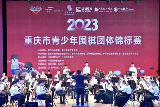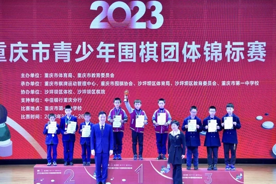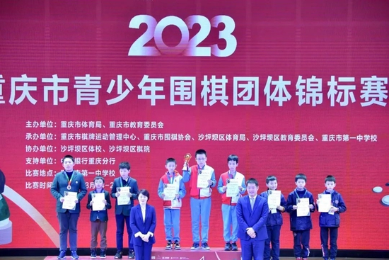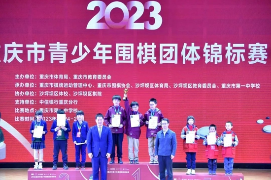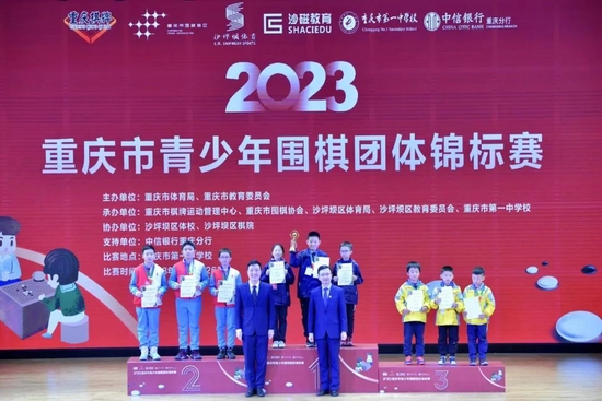 26日下午,伴随着重庆一中管乐团的精彩演奏,2023年重庆市青少年围棋团体赛闭幕式正式开始。重庆市原副市长程贻举,中国围棋协会副主席、棋圣聂卫平,中国围棋协会副主席、世界冠军常昊,中信银行重庆分行行长刘志华,重庆市体育局原副巡视员、重庆市围棋协会名誉会长杨一,重庆市棋牌运动管理中心副主任黄熹,重庆市围棋协会会长、8次世界冠军获得者、重庆一中校友古力,沙坪坝区体育局局长黄华东,沙坪坝区教委副主任李颖,重庆一中党委书记唐宏宇、校长毛明山、副校长周鹊虹、庄仕军,沙坪坝区围棋协会会长江舟,出席闭幕式并为获奖团队颁奖,台下掌声雷动。