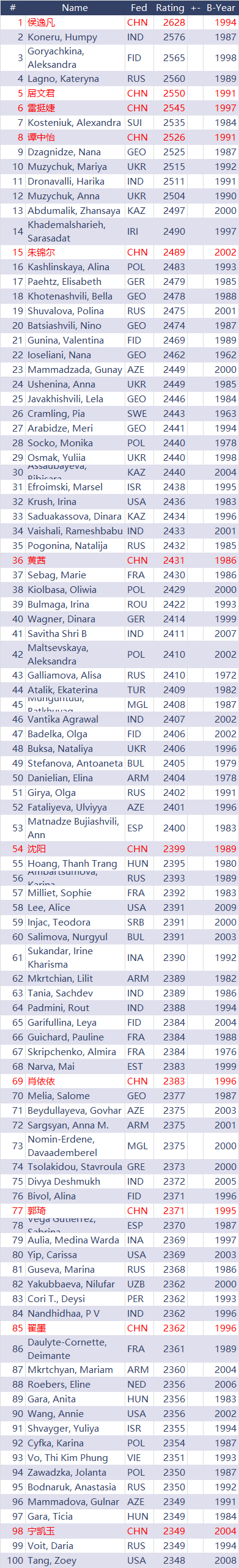 国际棋联2023年4月女子等级分:朱锦尔第15