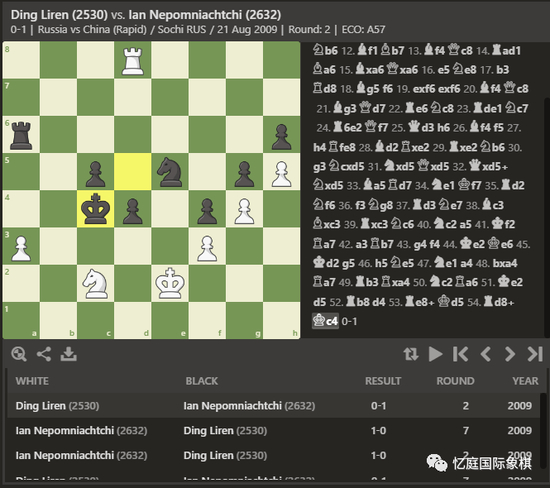 2009年8月,俄罗斯和中国在俄罗斯的索契进行了一场友谊赛。这时,涅波19岁,丁立人16岁。他们在比赛中进行了两盘快棋和两盘闪电战。中国的卫冕冠军在面对他的俄罗斯新对手时输掉了每一局。虽然是一场友谊赛,但对丁立人来说,这无疑是一场令人清醒的失败。(近十年后,在他的第13次尝试中,丁立人终于第一次击败了涅波。)
