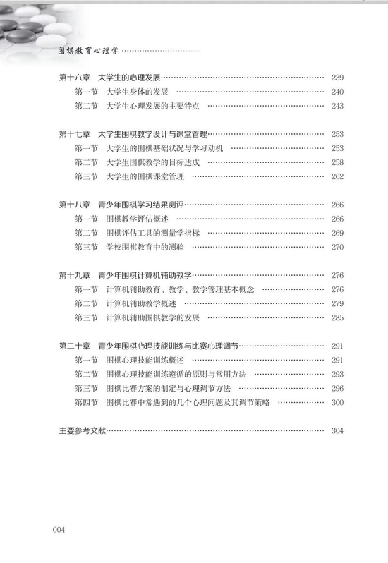 三是对围棋心理技能训练与比赛心理调节的探索与总结。围棋是竞技运动,不可能总停留于纸上谈兵。书中一直强调围棋教学中的实战、竞赛以及比赛心理调节,窃以为正是李毅老师在围棋教学中的独到之秘——这是让学生们明白今后面对挑战时应该有怎样的心境。这个论述主要针对围棋准运动员训练比赛心理技能与心理而准备,主要从四个方面进行阐述:围棋心理技能训练概述;围棋心理技能训练遵循的原则与常用方法;围棋比赛方案的制定与心理调节方法;围棋比赛中常遇到的几个心理问题及其调节策略。如果围棋教师能够仔细领会,认真消化并实践于教学中,无疑对学生实战时强大心理的锻造及提高比赛成绩有着特殊的功效。