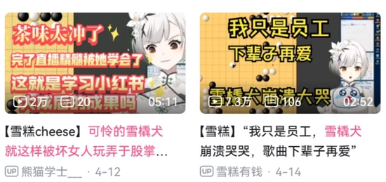这一点从二创中也明显体现出来,雪糕切片90%以上都是趣味向的,《雪糕cheese:抽查我学历是吧》《可怜的雪橇犬就这样被坏女人玩弄于股掌之中》,要不就是调侃她和柯洁存在男女友关系的CP向切片……