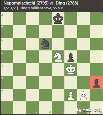 有关的残局在第55步达到了高潮,在涅波姆尼亚奇用早先的弃兵鼓起了最后的机会之后,丁立人被迫采取了紧急行动。在55.Ke7和 55.h3这两步棋中,丁立人选择了后者,声称他认为 “h3是拯救棋局的唯一一步”。弃兵,这的确是局面中两步最好的棋之一,是棋手们意识到最有可能达成和局的时刻。