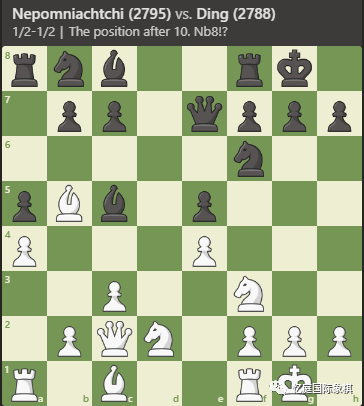 在11步棋中,两人都遵循了2022年Chess.com全球锦标赛决赛中GM 苏伟利和中村光的一盘棋,其中包括热门的10。 Nb8!?在九盘棋中拥有33%的胜率、44%的平局率和22%的负率,可以理解为什么丁立人发现这个变化很有趣。