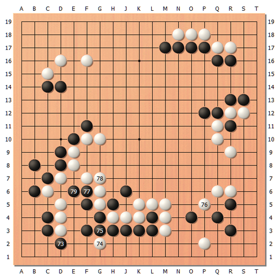 [图6]从结果来看,白76的小尖成为了败招。实战黑77和黑79这两手棋比想象中的要大很多。