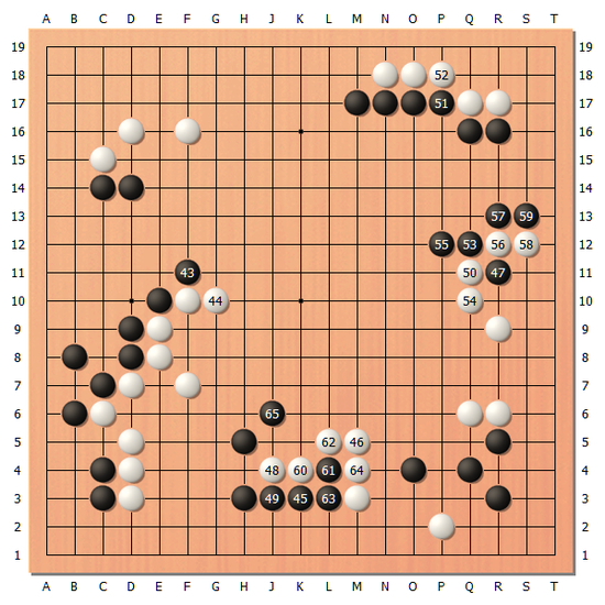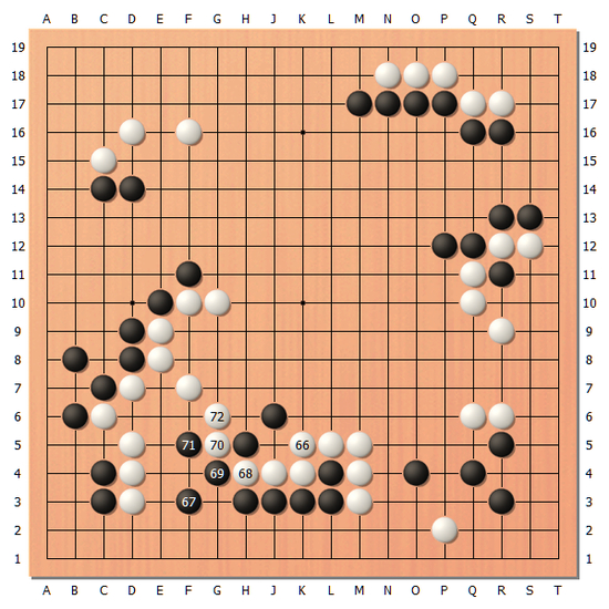 [图4]白60贴的时候,黑61开始的应对非常冷静,黑65小尖的时候感觉黑棋的处理还不错。
