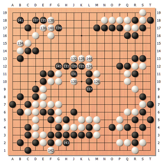 [图10]黑133的愚形看似笨拙,不过优势局面下确实不需要冒很大风险,黑145连回之后进一步缩小棋盘。