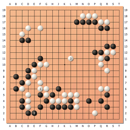 [图11]虽然后半盘出现了看似惊心动魄的场面,不过黑棋优势的局面依然没有撼动。最后应该是盘面10目以上。