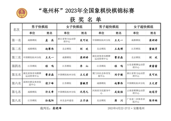 此外,在男子超快棋组比赛中,王天一获得冠军,赵攀伟获得第六名。