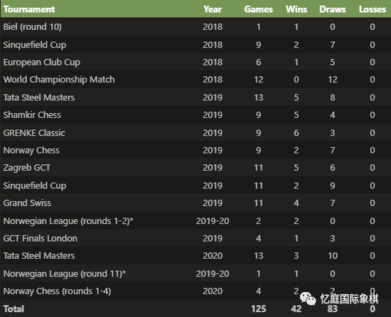 在2018年比尔站第九轮输给GM 马梅季亚洛夫之后,在GM 杜达2020年挪威站的第五轮比赛中获胜之前,卡尔森连续两年没有输棋。