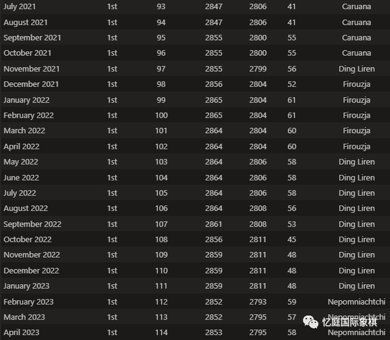 还有卡尔森作为世界排名第一的棋手的连胜,这在他成为冠军之前就开始了,并将在他不再是国际棋联世界冠军之后继续下去。下面的图表只包括他作为冠军的月份。