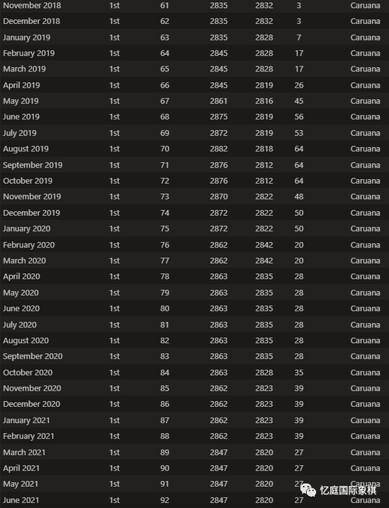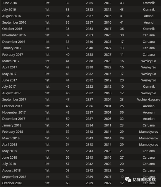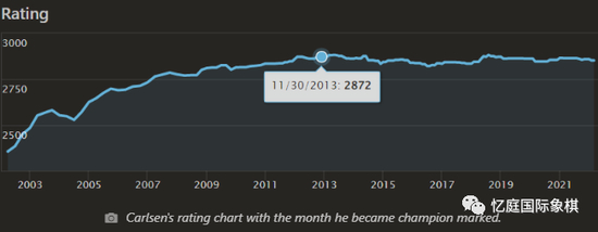 当然,卡尔森在2009年11月达到2800分之后,从未跌破过2800分。以前的冠军,甚至是卡斯帕罗夫,在他拥有冠军称号的整个期间都在2800以上。(卡斯帕罗夫确实在1990年成为第一个达到2800分的棋手,然后在1997年创造了2820分的职业生涯新高,此后他再也没有跌破过2800分)。而且公平地说,在等级分膨胀的情况下,卡斯帕罗夫可能也能做到这一点)。