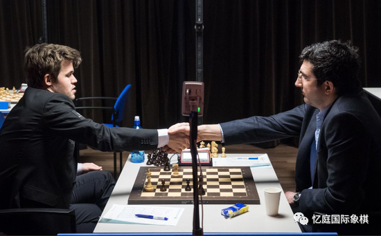 左边的卡尔森在2018年塔塔钢铁的比赛中与克拉姆尼克达成了平局。克拉姆尼克是2013年以来仅有的两位在等级分第一的位置上距离卡尔森10分以内的棋手之一。