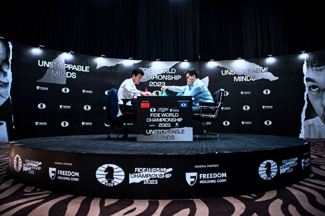 2023年国际象棋世界冠军赛进入冠军争夺的最后一战快棋加赛决胜,最终丁立人以2.5比1.5战胜涅波姆尼亚奇,本场比赛由特级大师王玥带来直播讲解,欢迎广大棋迷点击直播间观看回放。