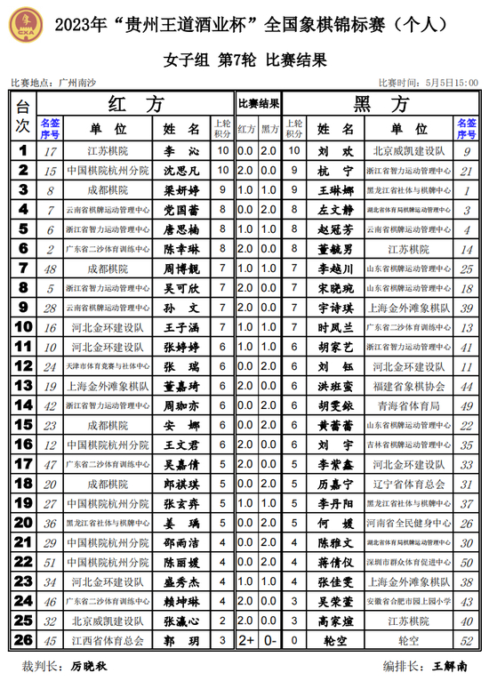 下午第七轮比赛,沈思凡、刘欢获胜,积12分领跑,以下李沁、梁妍婷、王琳娜、左文静、陈幸琳等积10分形成第二集团。