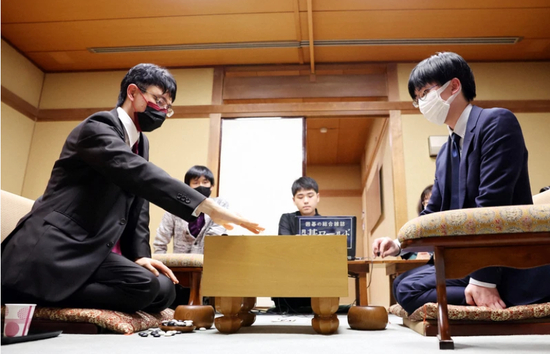 2023年4月13日当地时间晚8时1分,《每日新闻》记者拍摄下第78届本因坊战循环圈第7轮一力辽胜芝野虎丸之局的复盘场景。这是走过八十余年沧桑岁月的本因坊战最后一场循环圈赛。